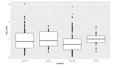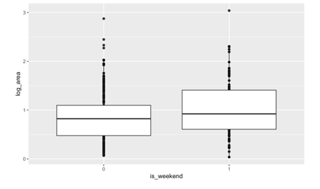 I made hypotheses that fires are more likely occur on weekends and affect by seasons. As we see from figure 3, burn areas tend to be larger during the weekends than the weekdays. Figure 4 indicates that forest fire burn area does have seasonality. I introduced 2 new variables: “is_weekend” and “season” into the dataset and converted these categorical variables into binary features.