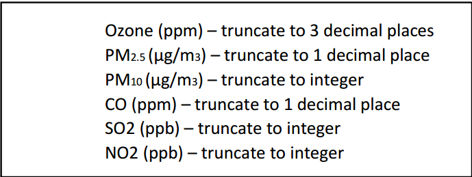 | Pollutant | Scientific name | Unit of Measurement | Input Code Usage | Regular Calculation Support | Nowcast Support | Health Effects Statements | Guidance Message |