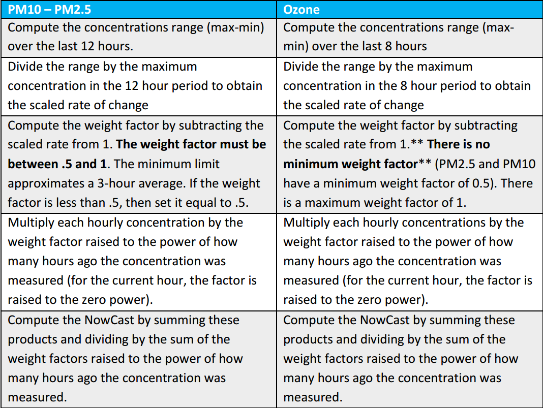 The concentration of PM10, PM2.5 is so dynamic since wind can completely clean the air in less than 30 minutes, or a wildfire can raise the concentration with a very fast rate in an hour. So Nowcast is introduced, it mainly focus on detect the average changing of the period hour and perform counter balancing.