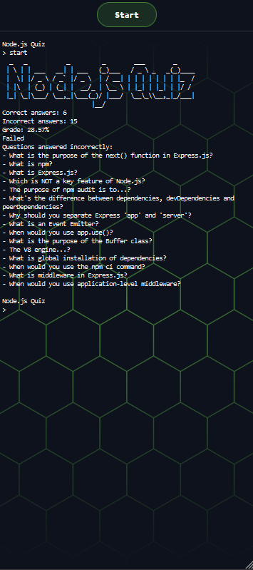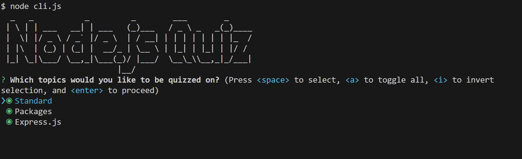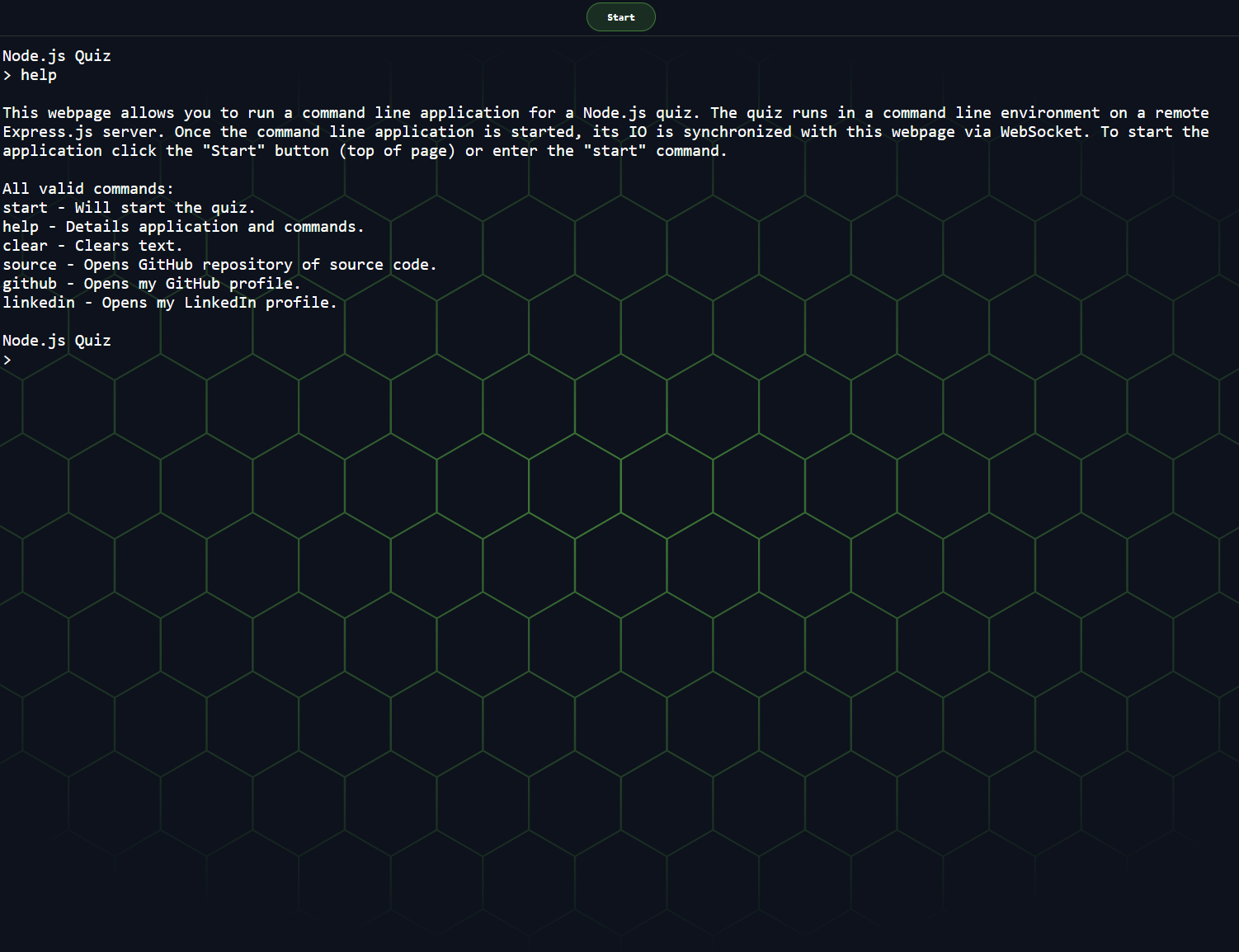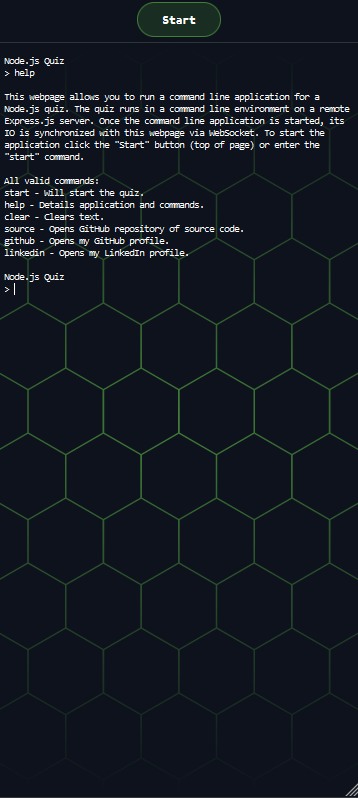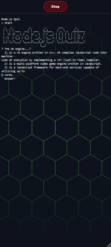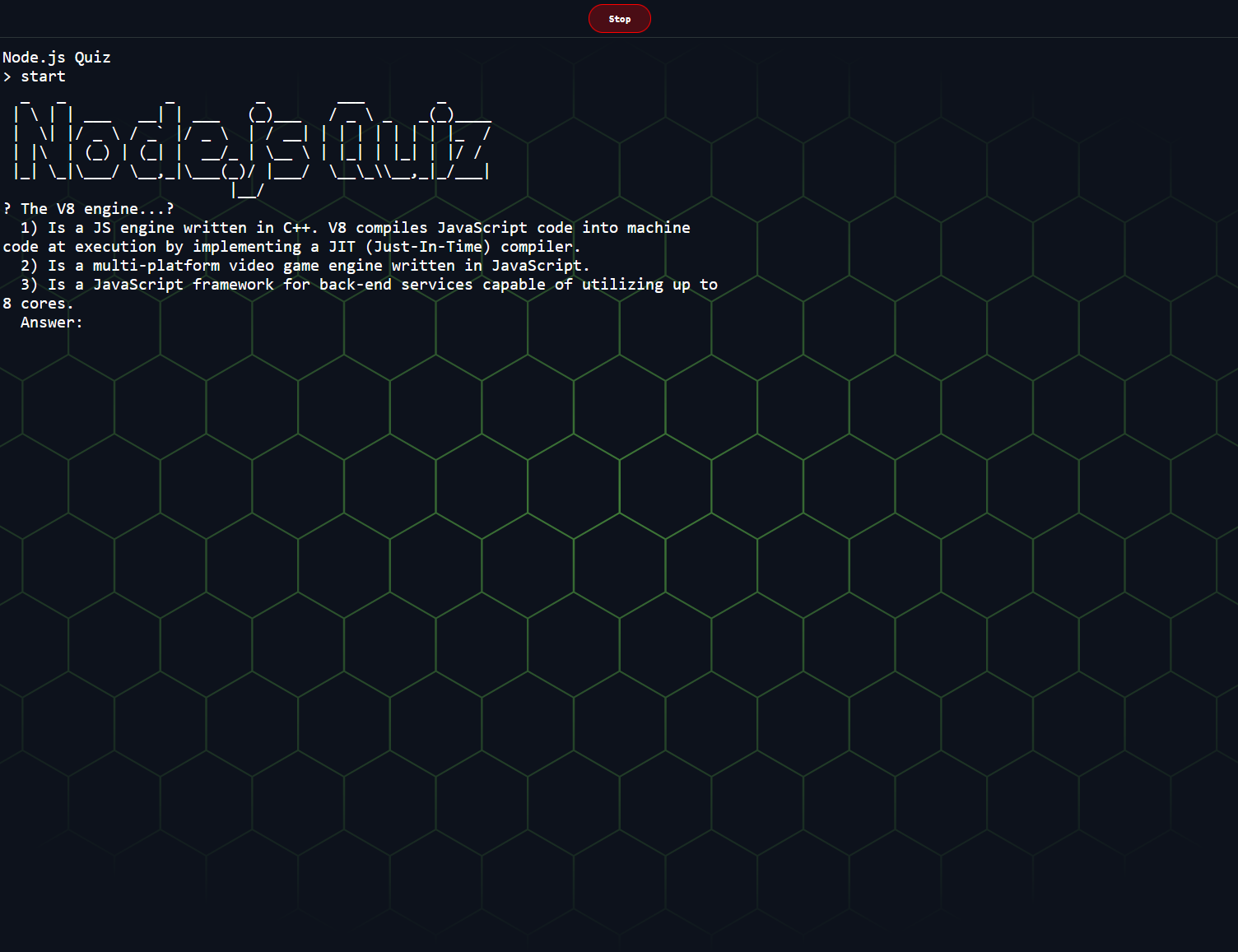 A Node.js quiz through a Node.js command line program. The program can be used directly in a command line environment or indirectly via webpage. The latter leverages WebSockets and Node child_process to pipe input and output between web client and command line environment. The webpage is served using Express.js.