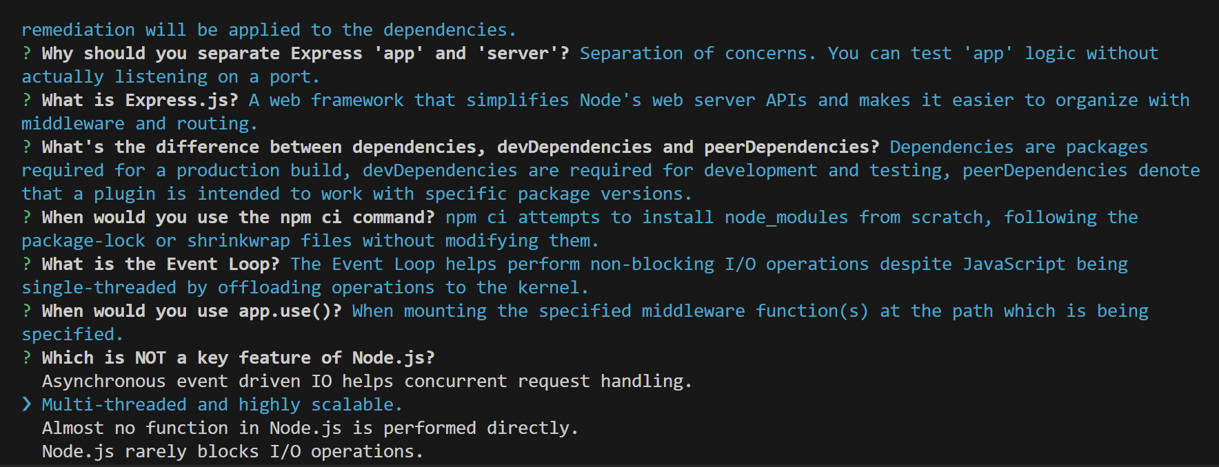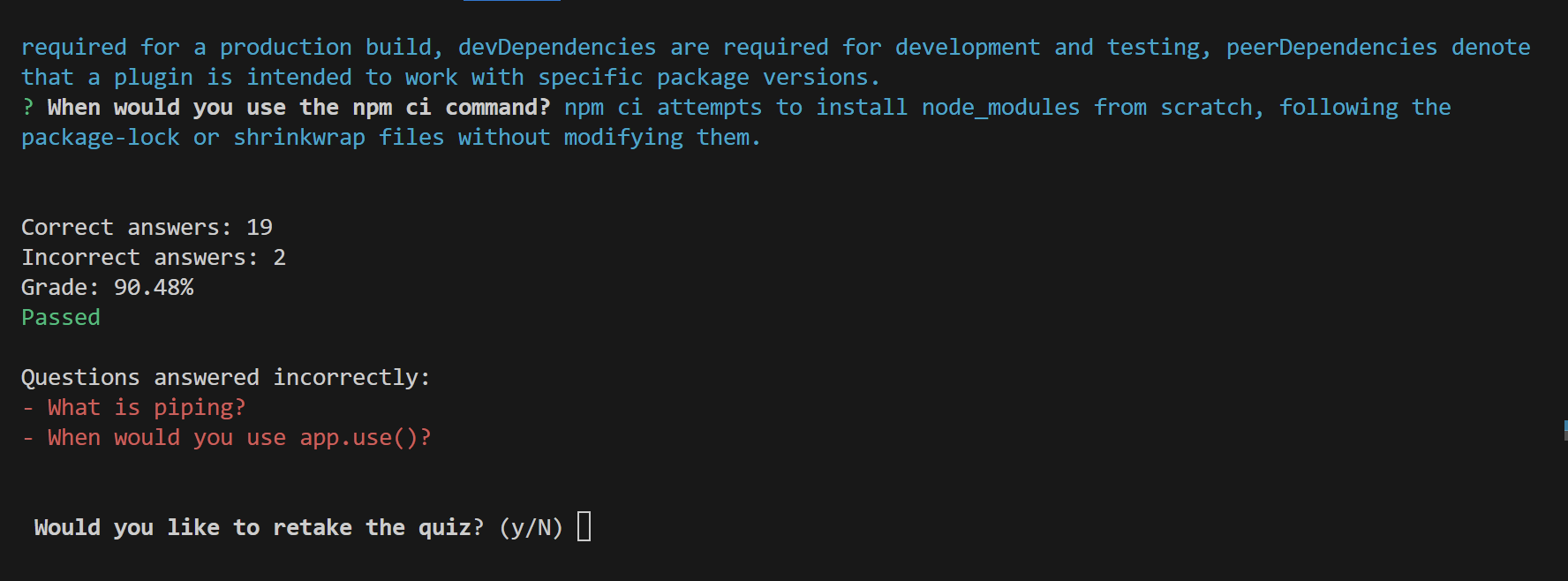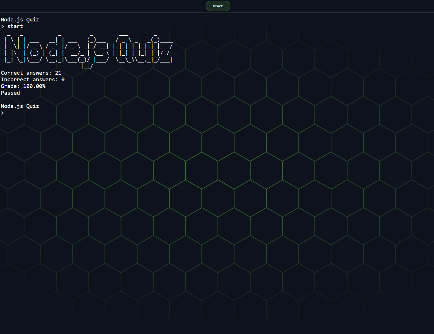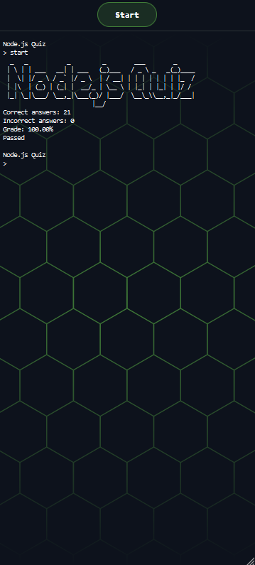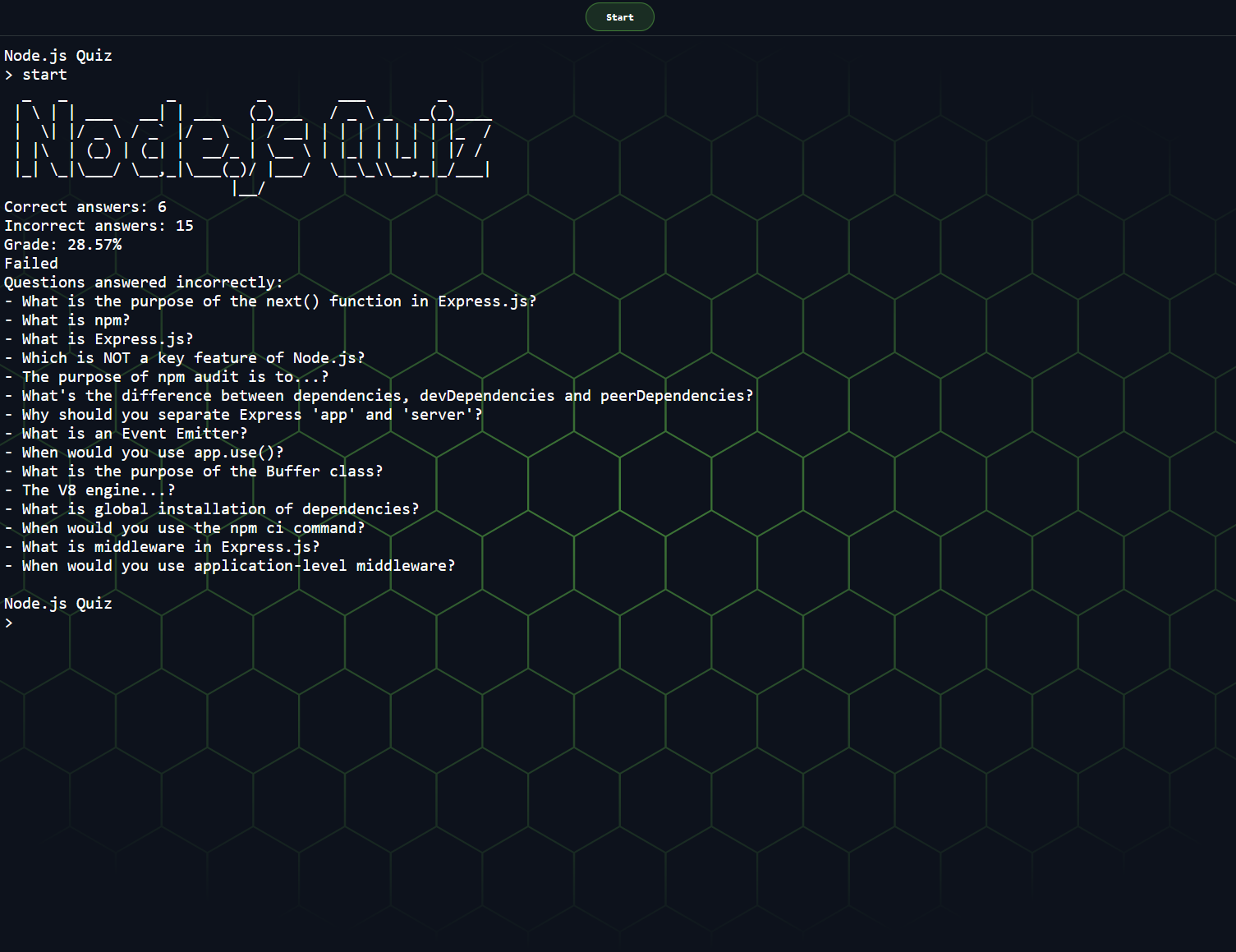 A Node.js quiz through a Node.js command line program. The program can be used directly in a command line environment or indirectly via webpage. The latter leverages WebSockets and Node child_process to pipe input and output between web client and command line environment. The webpage is served using Express.js.