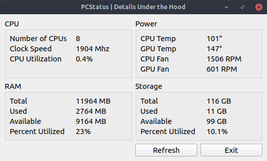 A small utility app that shows various data about your CPU, GPU, RAM and Storage. Linux only.