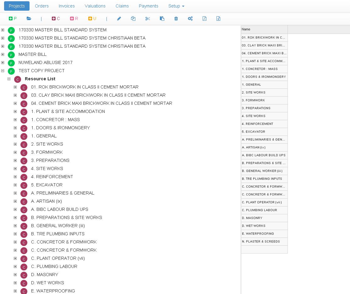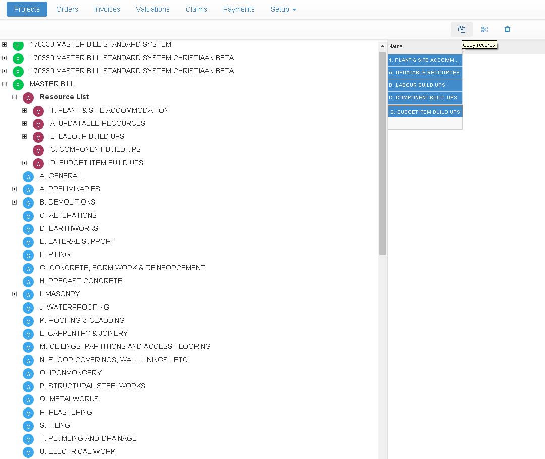 · As jy dit anders probeer en die Recourses direk copy uit die Master Bill om dit te select (see picture 3)en dan copy (copy records) en paste in die nuwe projek se leë Recourse lys dan verloor dit die hele struktuur van die oorspronklike Master Bill Recourse lys (compare picture 3 and 4)