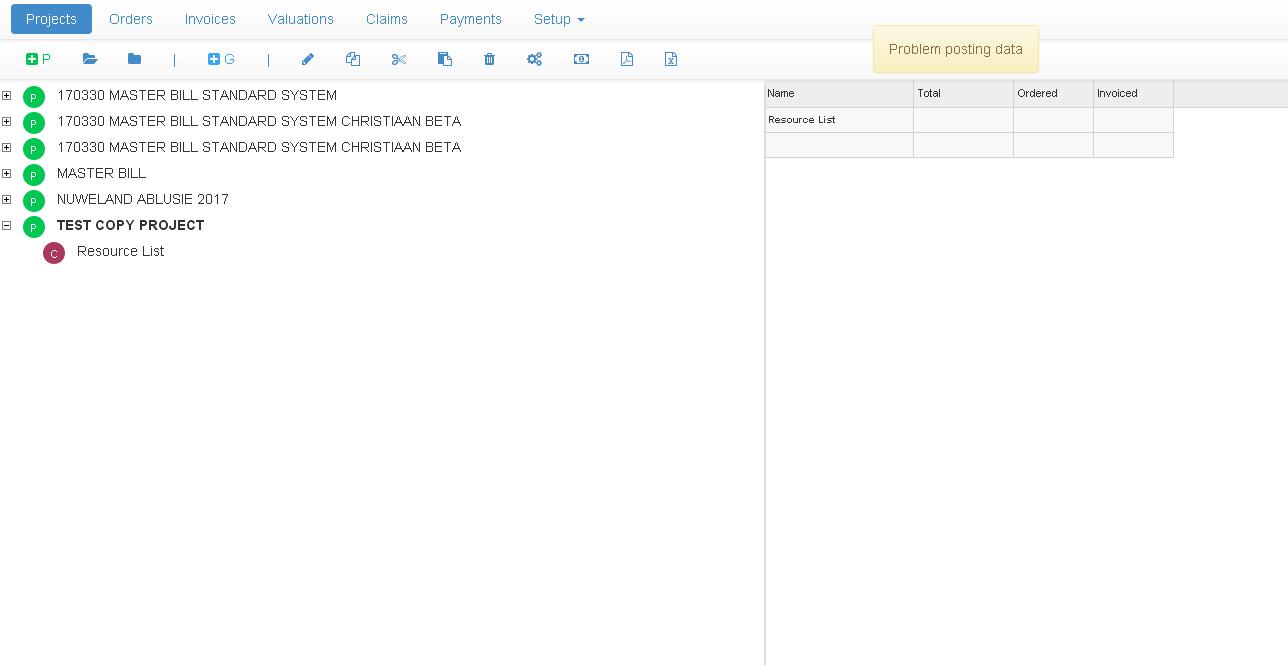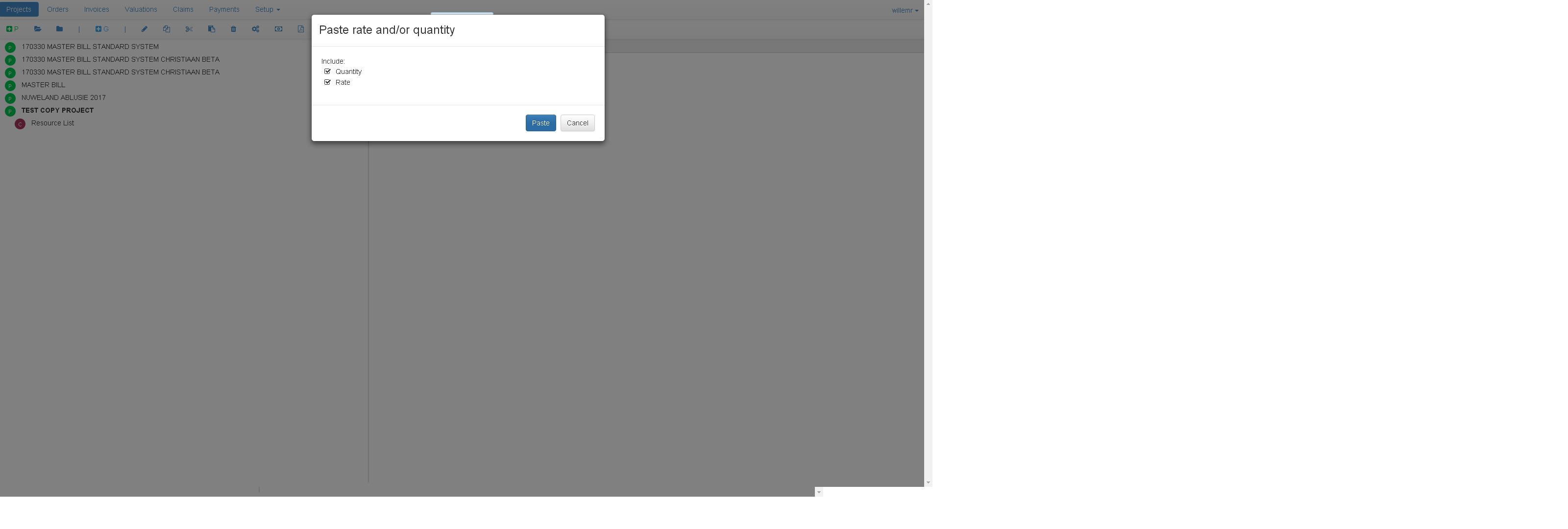 · Ons skep nou ‘n nuwe projek om deur sy fasette te neem. Sodra ek die Master Bill Copy en Paste in die nuwe projek (Include: Quantities & Rates – see picture 1) dan gee dit die error “Problem Posting Data”(see picture 2).