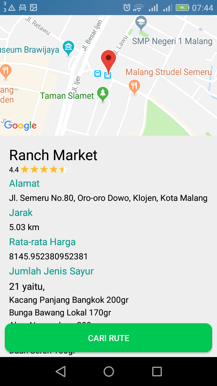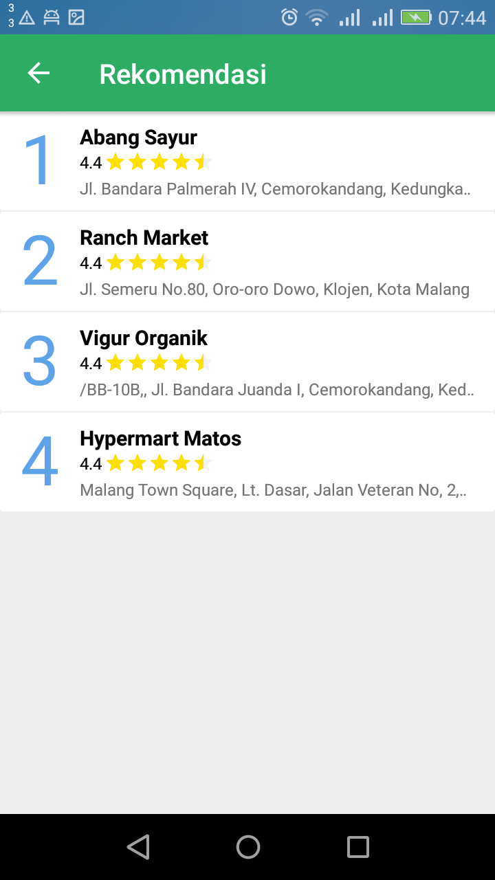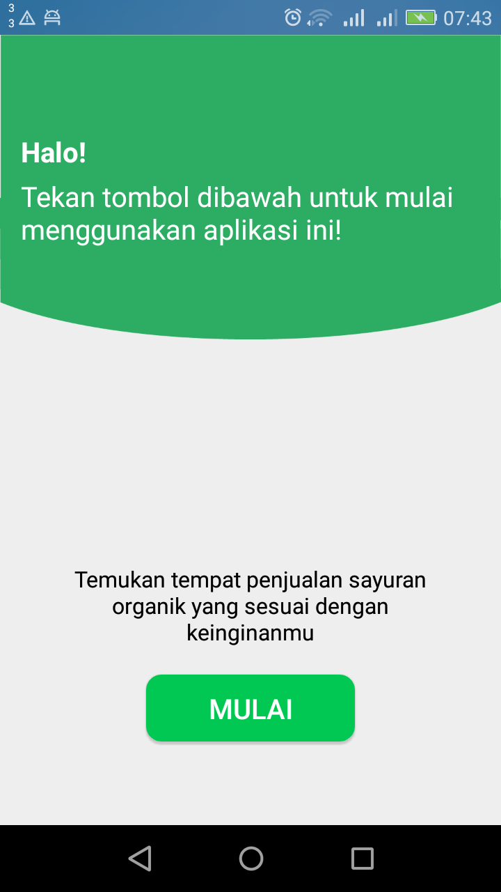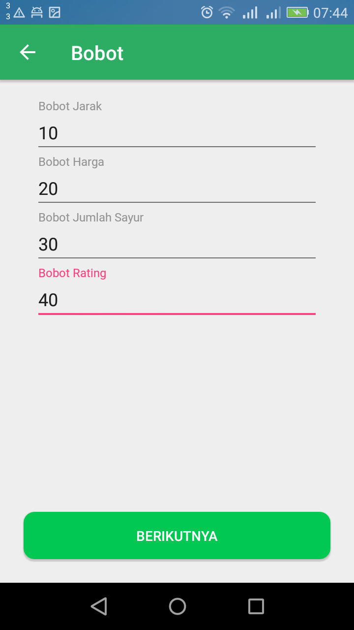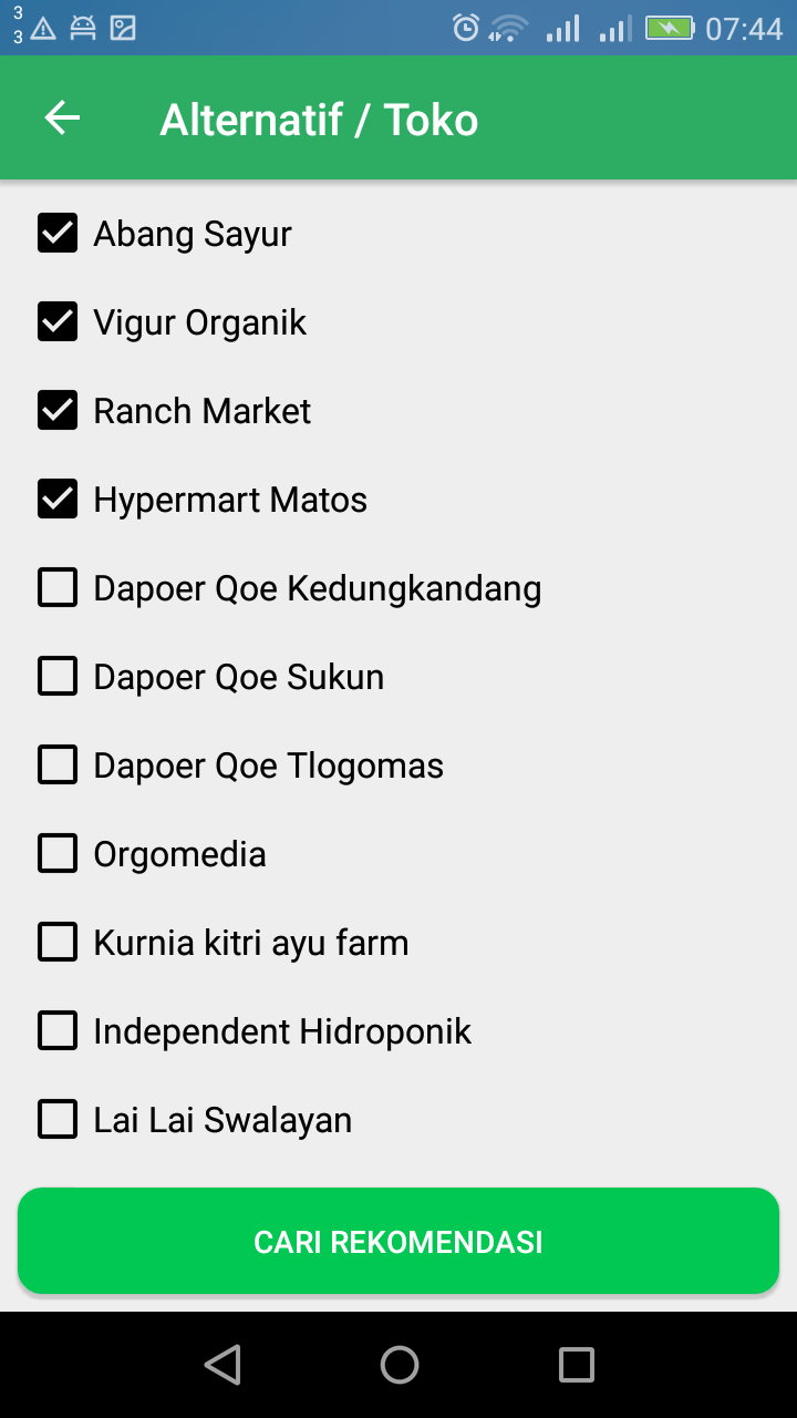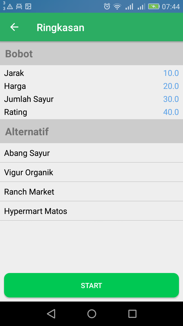 CariSayur Android app to find the best organic store. This is home page This page for input weight of all criteria Select alternative Show the summary The result from recommended store to stores are not recommended Detail information about selected store