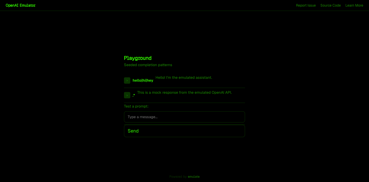 Adds an OpenAI API emulator with chat completions (non-streaming + SSE streaming), deterministic embeddings, model listing, and an interactive playground UI. Responses are seeded via config patterns - same input always produces the same output.