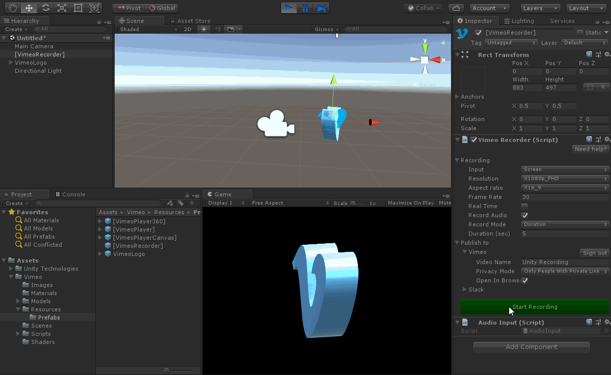 The Vimeo Recorder is built on top of Unity's native MediaEncoder to make it simple to capture your Unity scene and share to Vimeo. Features include: