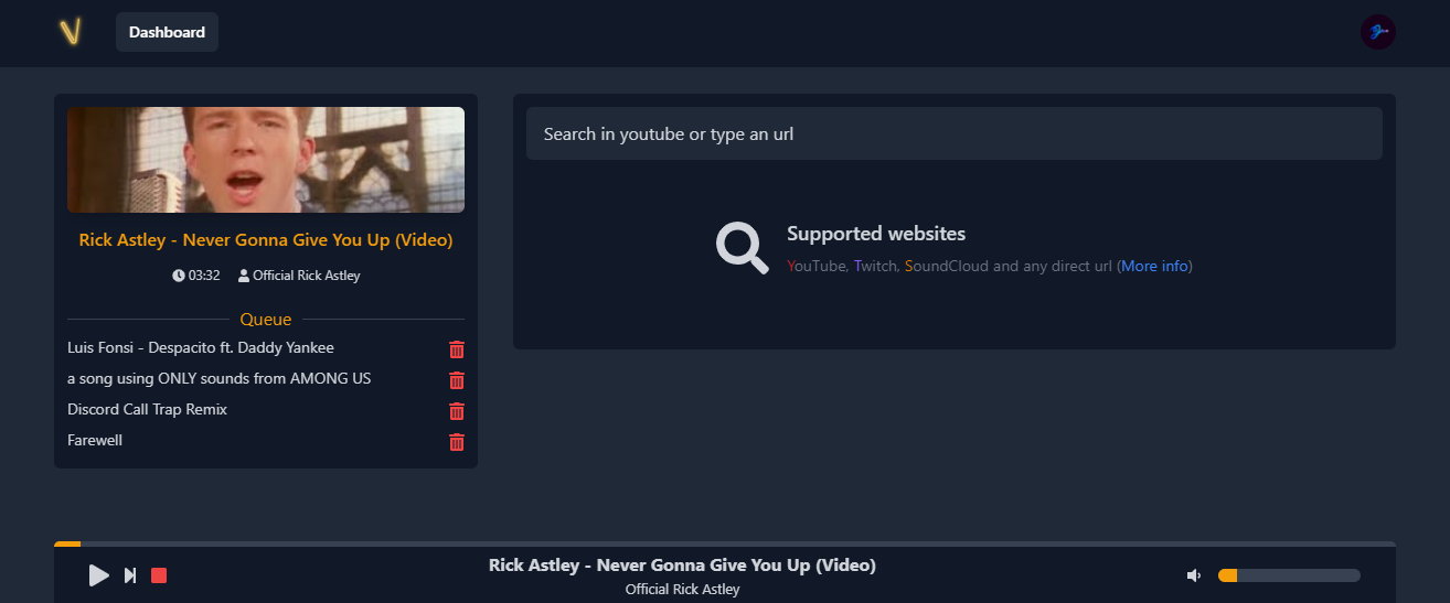 Vured is a self-hosted music bot you can interact with by clicking buttons or using a web interface.