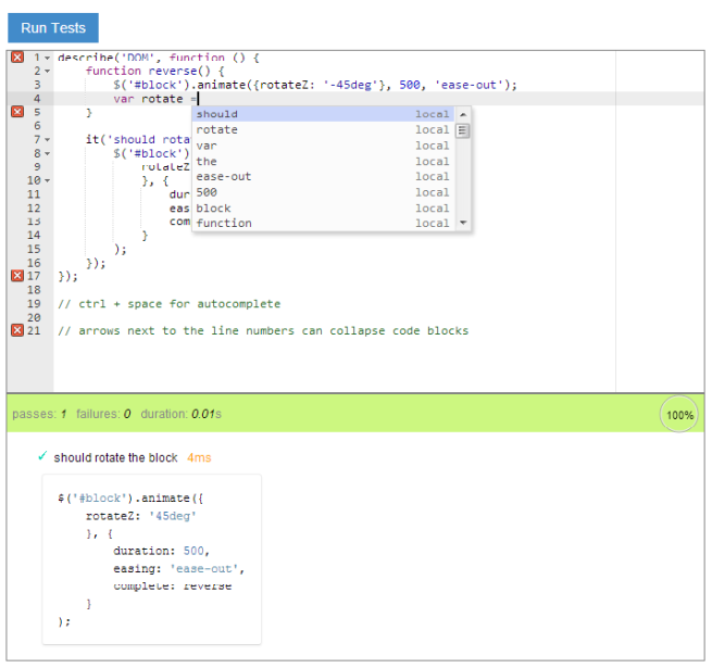 Move your mouse over the test runner on the right side and click the Run Test button to see it in action. You can also write code in the editor and run it against your browser.