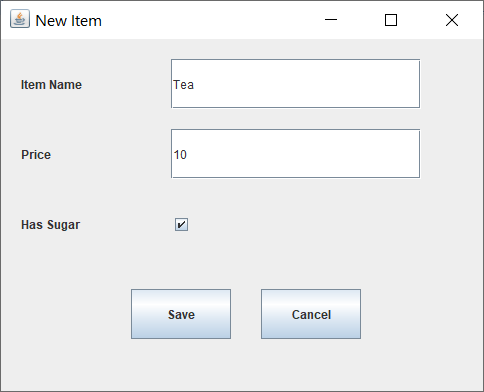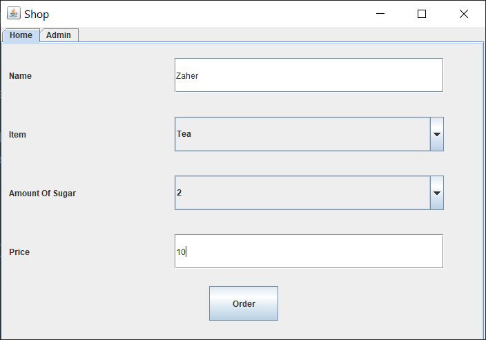 This window will help us to order a specific drink, we add the name of the person and the name of the drink we want, the amount of sugar is from 1-10, and the price of the drink, Each drink has a specific price