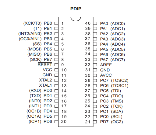 - Znaleźć numer wyprowadzenia układu związany z pierwszym dostępnym przerwaniem zewnętrznym (INT0) oraz w dokumentacji biblioteki interrupt.h znaleźć nazwę wektora przerwania odpowiadającą temu przerwaniu.