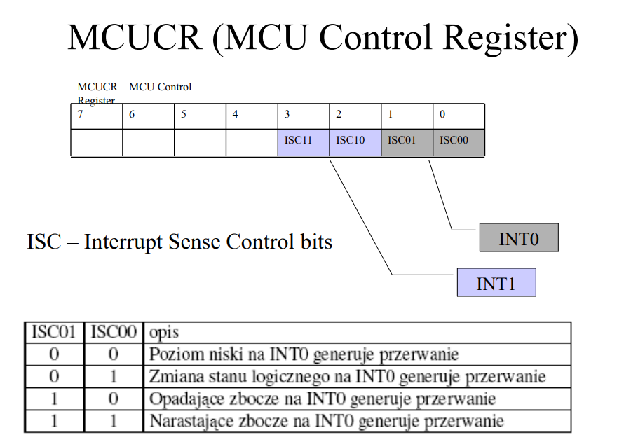 Ponadto chcemy reagować tutaj na zbocze opadające, a to znaczy że trzeba ustawić konkretne bity rejestru MCUCR (MCU Control Register), a oto ściąga z wykładu:
