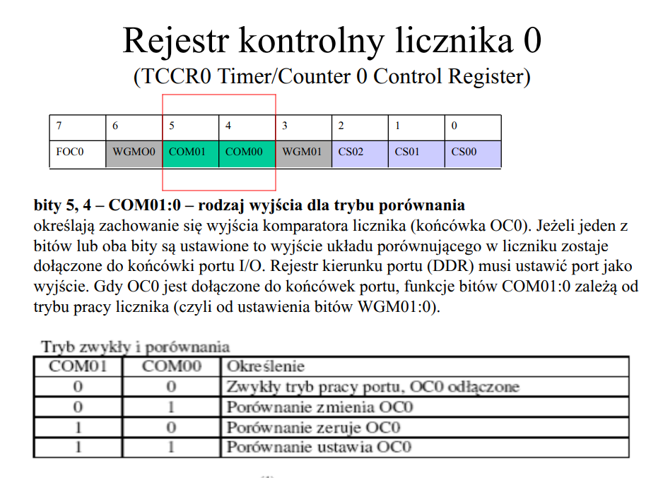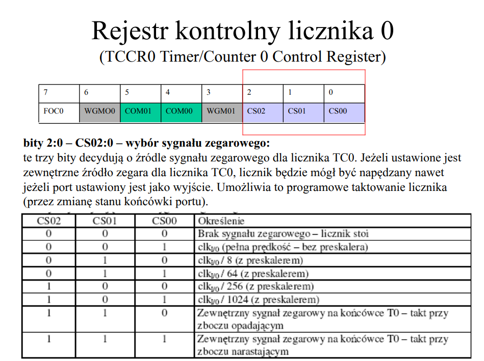- Skonfigurować licznik (Timer/Counter0) tak aby co 2 ms wykonywał zapalenie kolejnej cyfry na wyświetlaczu. Wartości cyfr do wyświetlenia należy przechowywać w zmiennych globalnych (np. j,d,s,t).